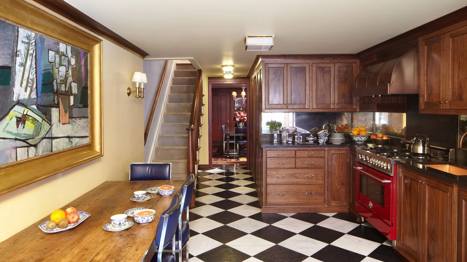 The kitchen sits at the front entry of the house and employs a mix of walnut cabinetry, antique mirror finishes, a black and white checkered marble floor and commanding red appliances. At the rear, a dining room is carved out that opens to the back yard. The space in between discretely houses a powder room, laundry and much needed storage closets.